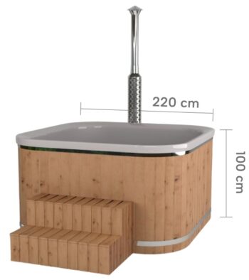 6 személyes, 220 × 220 cm-es prémium négyzetes fürdődézsa, beépített rozsdamentes acél kályhával és kéménnyel.