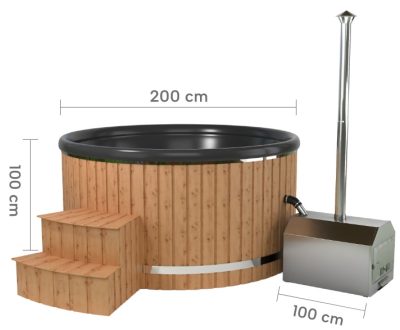 Ez a 200 cm átmérőjű, 6 személyes kültéri fürdődézsa rozsdamentes acélból készült, külső fatüzelésű kályhával és kéménnyel felszerelt modell, amely nagyobb belső teret és kényelmesebb elhelyezkedést biztosít.