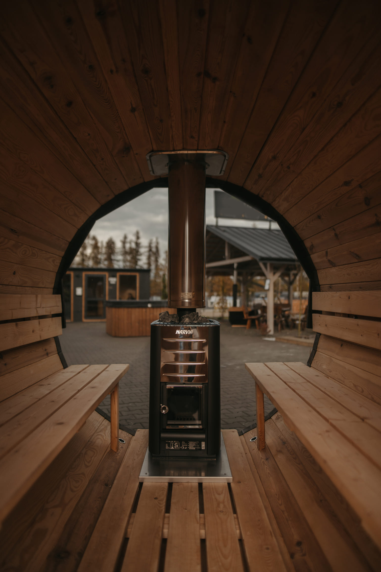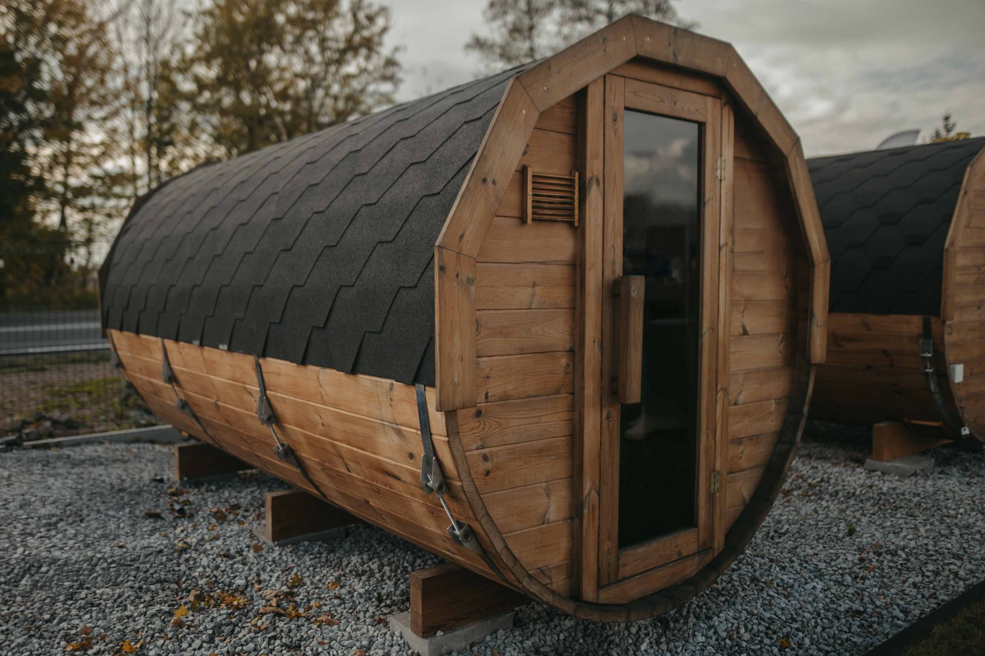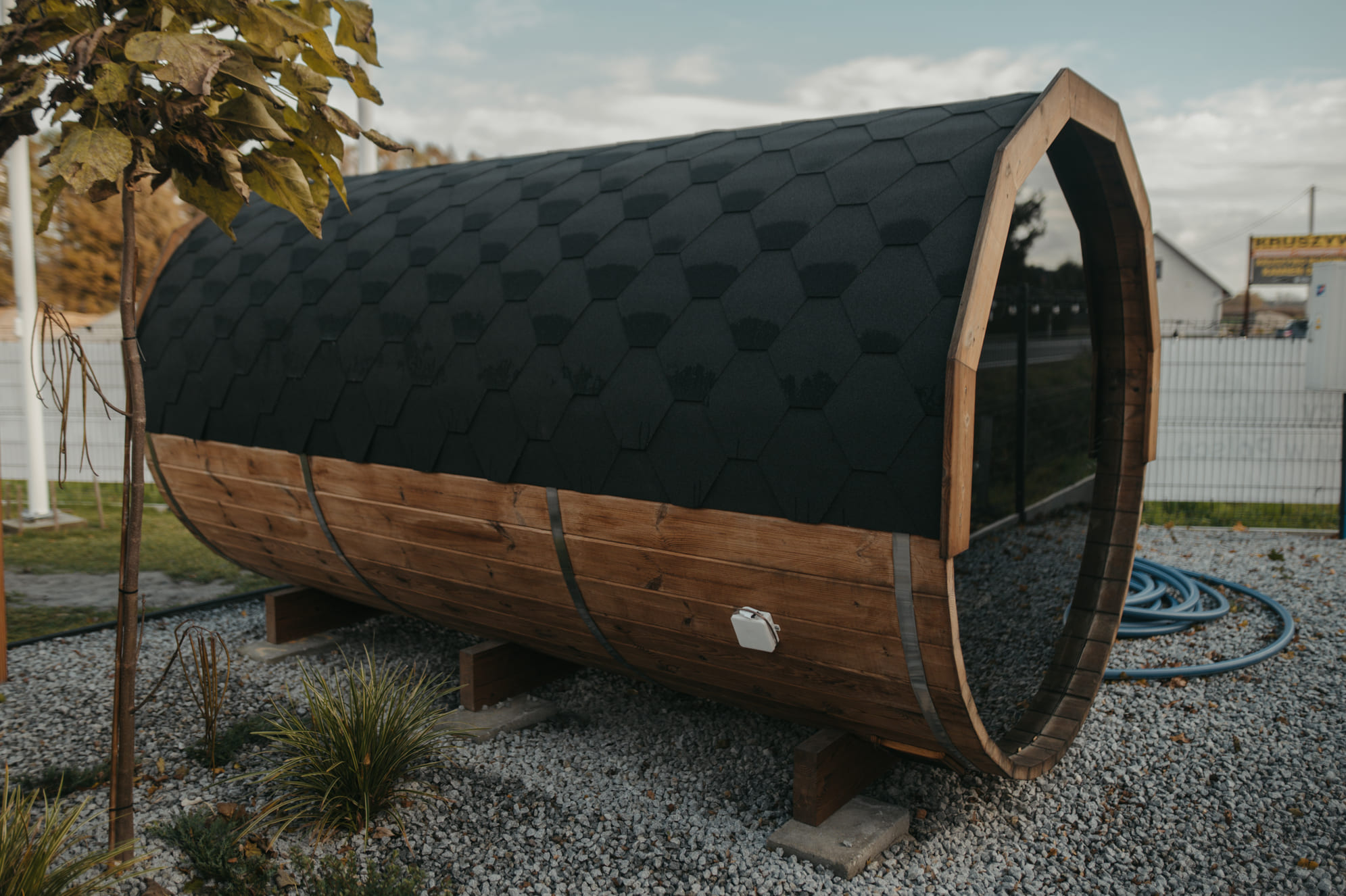 A szauna megbízható szaunakályhával van felszerelve, amely lehetővé teszi a hőmérséklet egyszerű szabályozását. Természetes megjelenése harmonikusan illeszkedik bármilyen kertbe vagy kültéri környezetbe, így tökéletes választás családi pihenéshez vagy baráti wellness élményekhez.