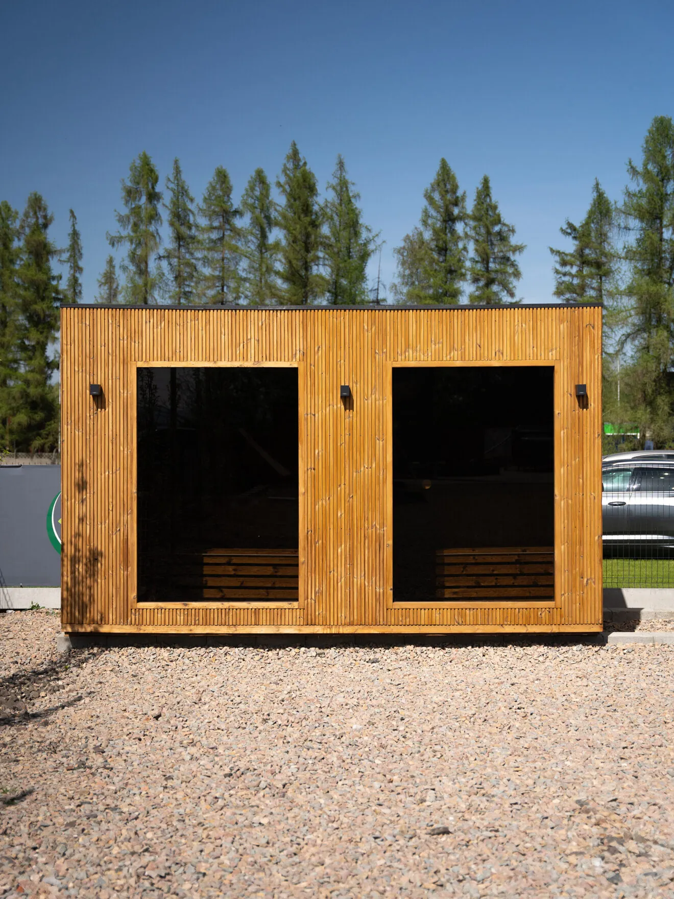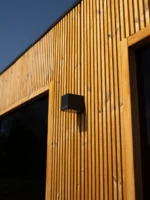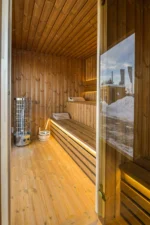A szauna alapját egy masszív lucfenyő szerkezet képezi, amely kiváló stabilitást és hosszú élettartamot biztosít. A külső burkolat tartós panelekből készült, amelyek ellenállnak az időjárási hatásoknak és hozzájárulnak a szauna modern megjelenéséhez.